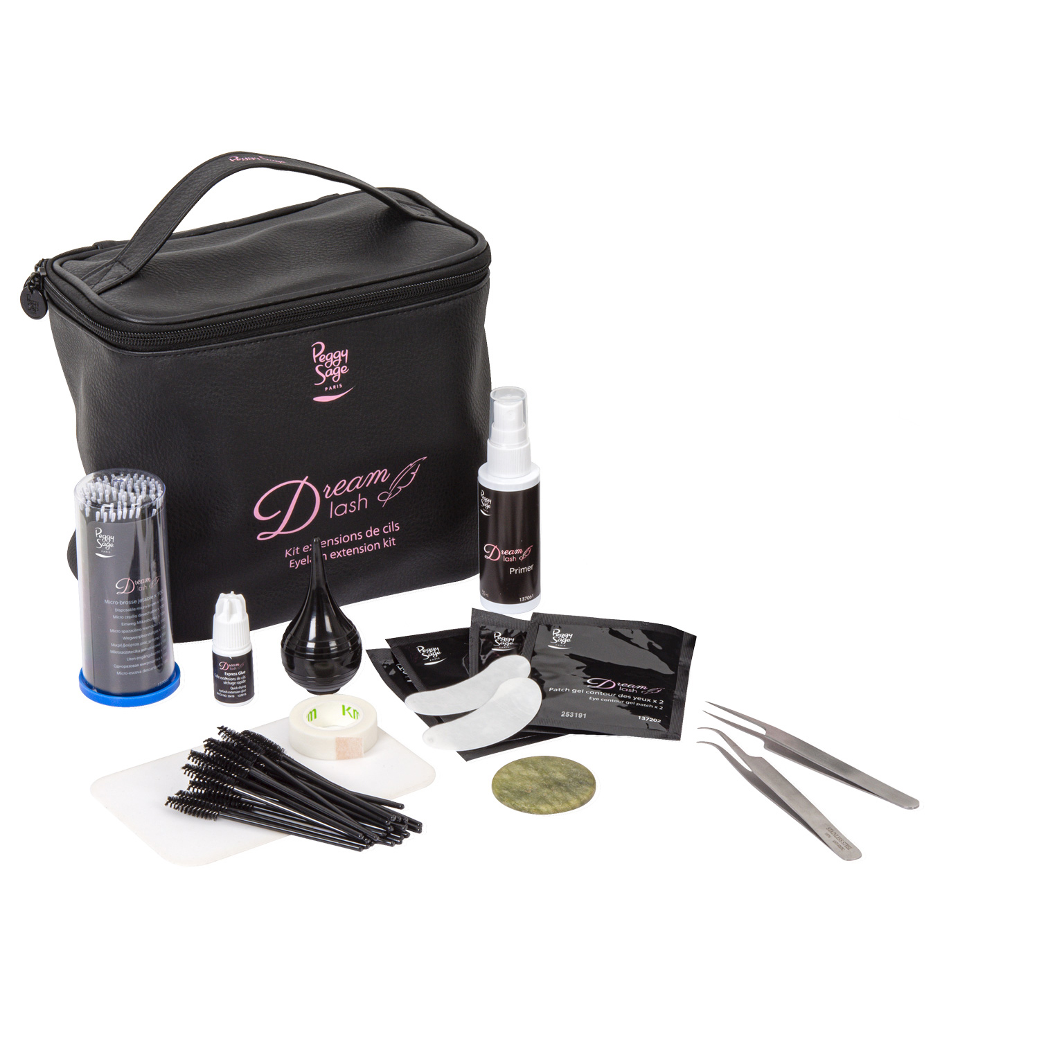 Contiene : express glue – cola extensiones de pestañas – secado rápido 5 g (137215), primer extensiones de pestañas 50 ml (137061), parche de gel contorno de ojos 2 x 5 (137202), cinta adhesiva microporosa (137204), pincel escobilla desechable x 25 (137091), micro cepillo desechable x 100 (137065), piedra de jade (137090), tapete de aplicación (137060), pinzas para extensiones de pestañas – tomar (137084), pinzas para extensiones de pestañas – Aislar (137081), pera de secado (137070).